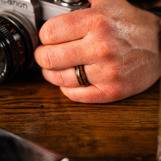 The Badger - Men's Ring / Wedding Band - Black Plated Tungsten with Double Oak Wood Inlays