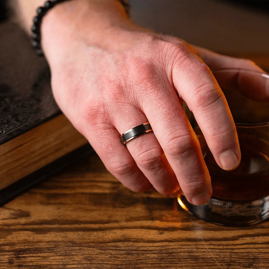 The Fitzgerald - Men's Ring / Wedding Band - Charcoal Gray Zirconium with Rose Gold