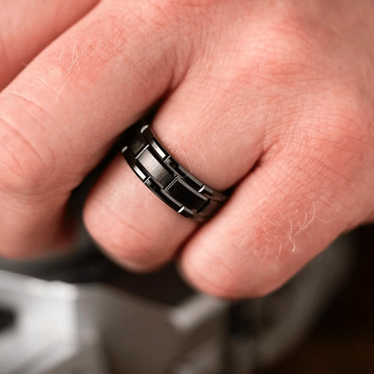 The Keep - Black-Plated Tungsten with Brick Design