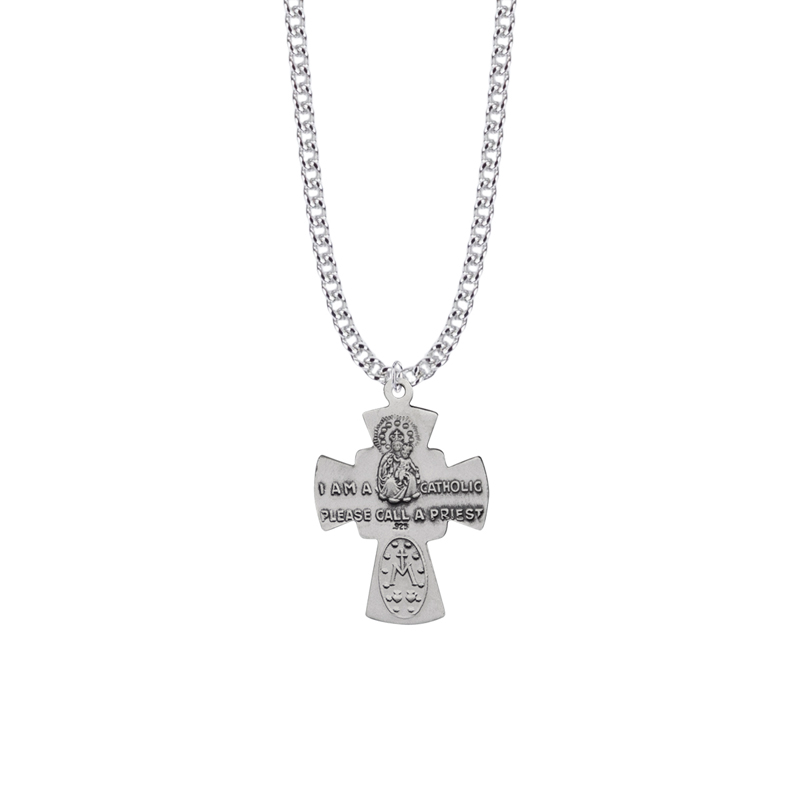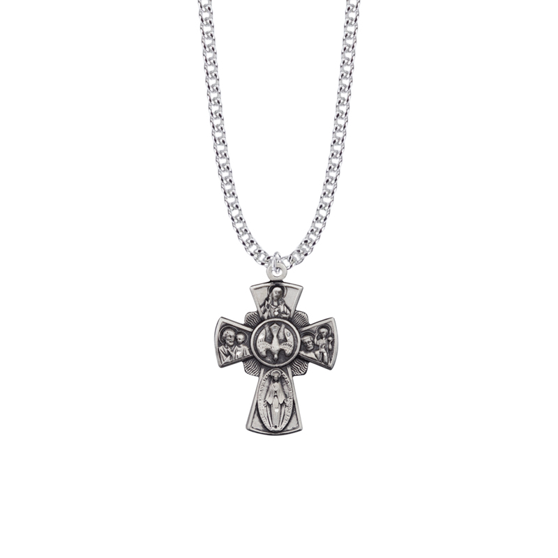 1-1/4 x 7/8 inch satin and antiqued finish sterling silver engraved Five Way medal on a 24 inch stainless steel rhodium plated chain. The medal pendant is shaped like a cross and has an antiqued finish dove in the center of the cross. There are four raised and engraved symbols on each end of the cross: St. Christopher, the Sacred Heart, St. Joseph, and the Miraculous Medal. The addition of the dove allows this medal to also be considered a Five Way medal as the dove is a symbol of the Holy Spirit.