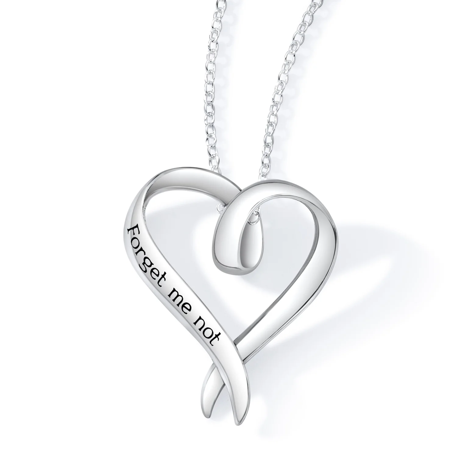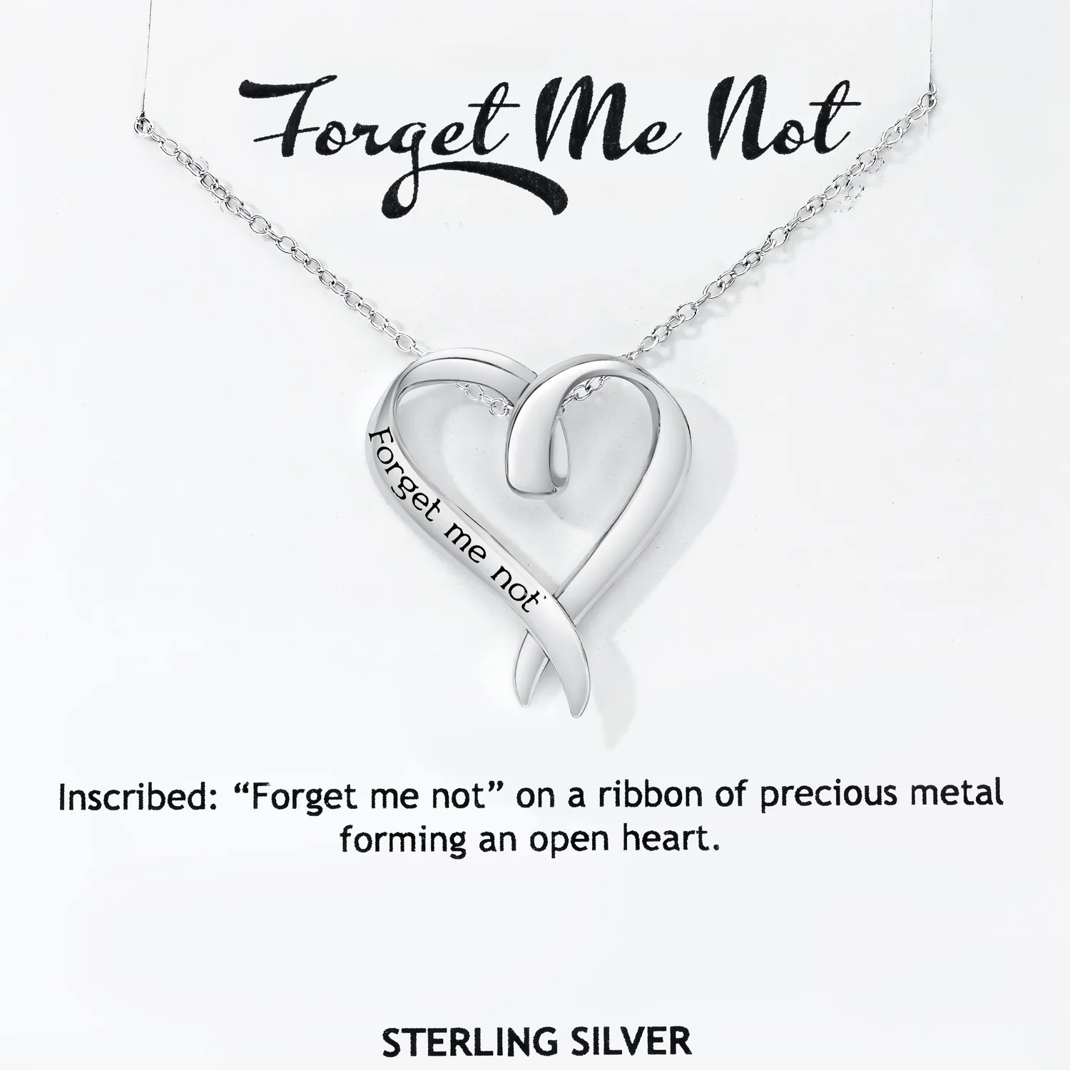 This elegant, sterling silver open heart pendant is finely engraved with "forget me not". According to the traditional Victorian language of flowers, the Forget Me Not flower was seen as a token of true love and remembrance: