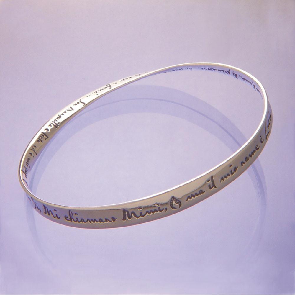 This elegant sterling silver Mobius bracelet is finely engraved with the famous aria from Puccini's La Boheme: