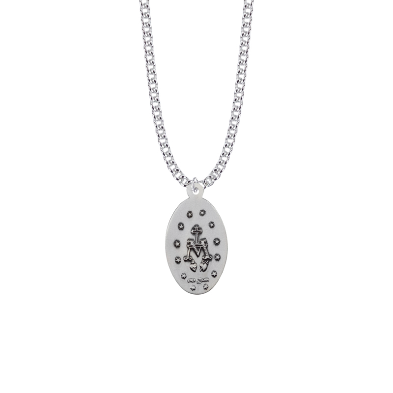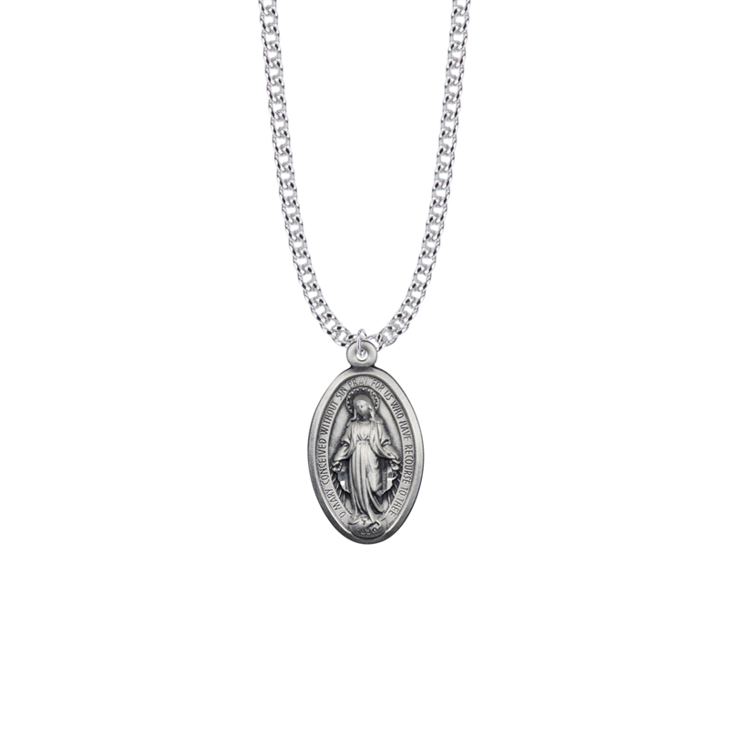 Wear your faith close to your heart with this elegant oval Miraculous Medal of the Virgin Mary. 1-1/8 x 5/8 inch satin and antiqued finish sterling silver oval Miraculous Medal on a 24 inch stainless steel rhodium plated chain. Proudly made in the USA.