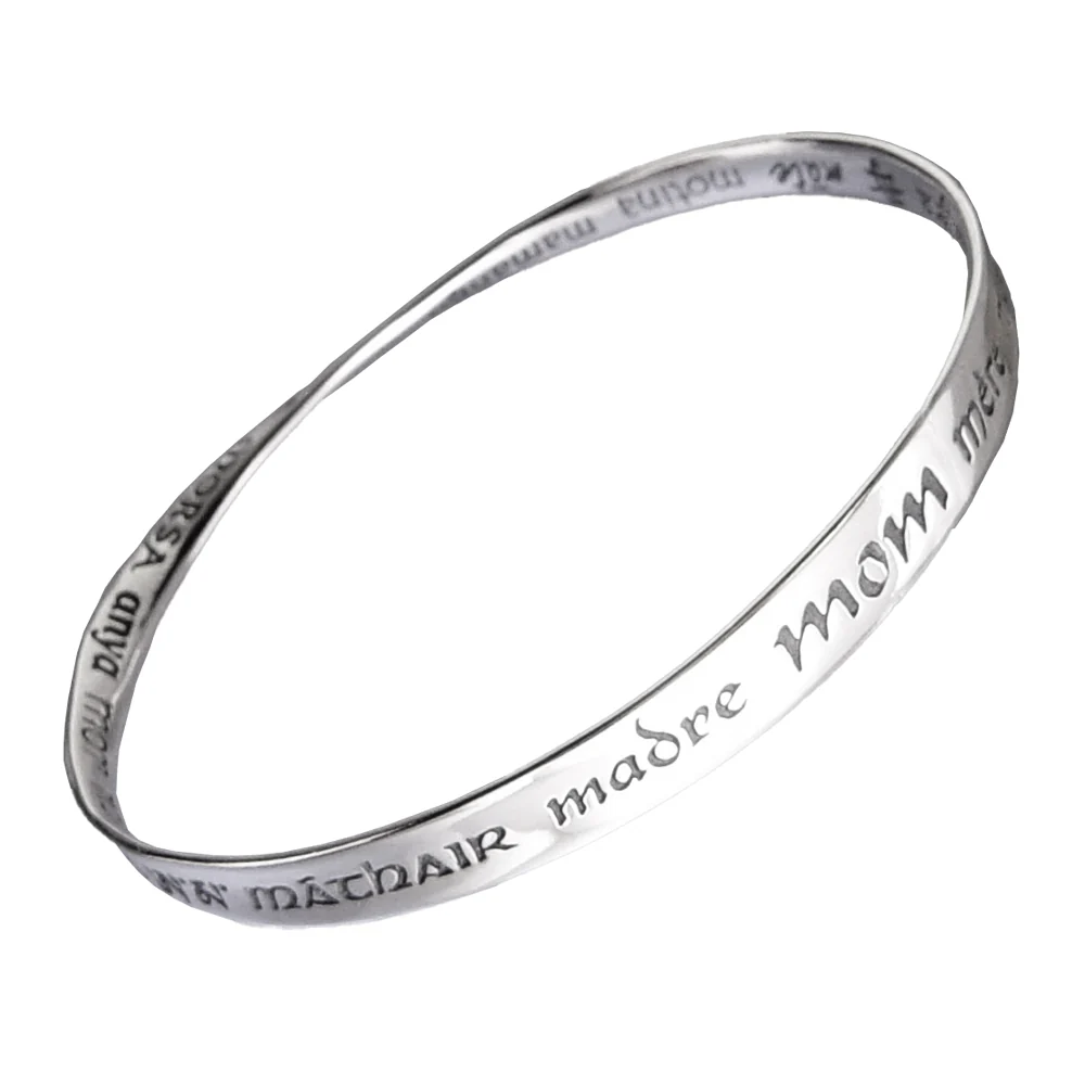 This remarkable piece of jewelry employs the uniquely beautiful geometric form known as a Mobius strip, named after the talented German mathematician, August Ferdinand Mobius (1790-1868). The cleverly curved design of the Mobius strip appears to have one uninterrupted side or plane, allowing the bracelet or pendant to be inscribed with a surprisingly large number of meaningful