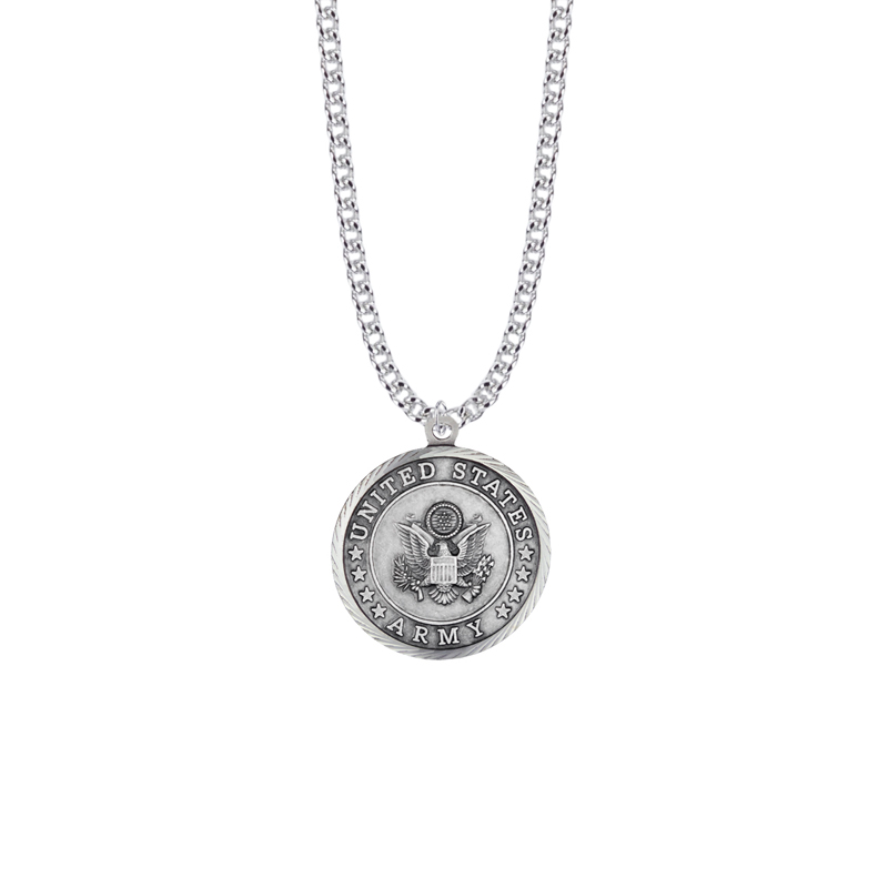 1-1/8 x 1 inch round satin and antiqued finish sterling silver U.S. Army symbol medal on a 24 inch stainless steel rhodium plated chain.