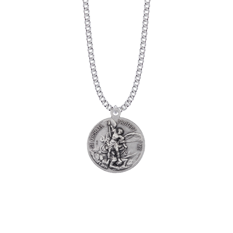 On the back is a raised depiction of St. Michael the archangel surrounded by the words, "St. Michael Protect Me" on top.