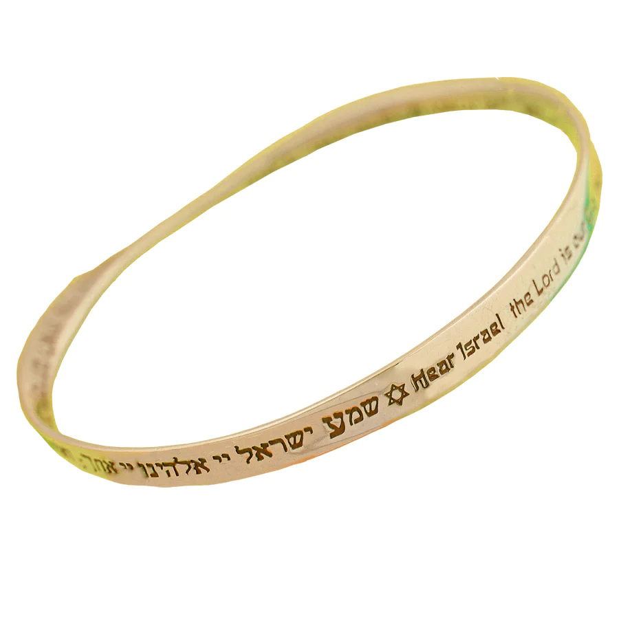 This remarkable piece of jewelry employs the uniquely beautiful geometric form known as a Mobius strip, named after the talented German mathematician, August Ferdinand Mobius (1790-1868). The cleverly curved design of the Mobius strip appears to have one uninterrupted side or plane, allowing the bracelet or pendant to be inscribed with a surprisingly large number of meaningful