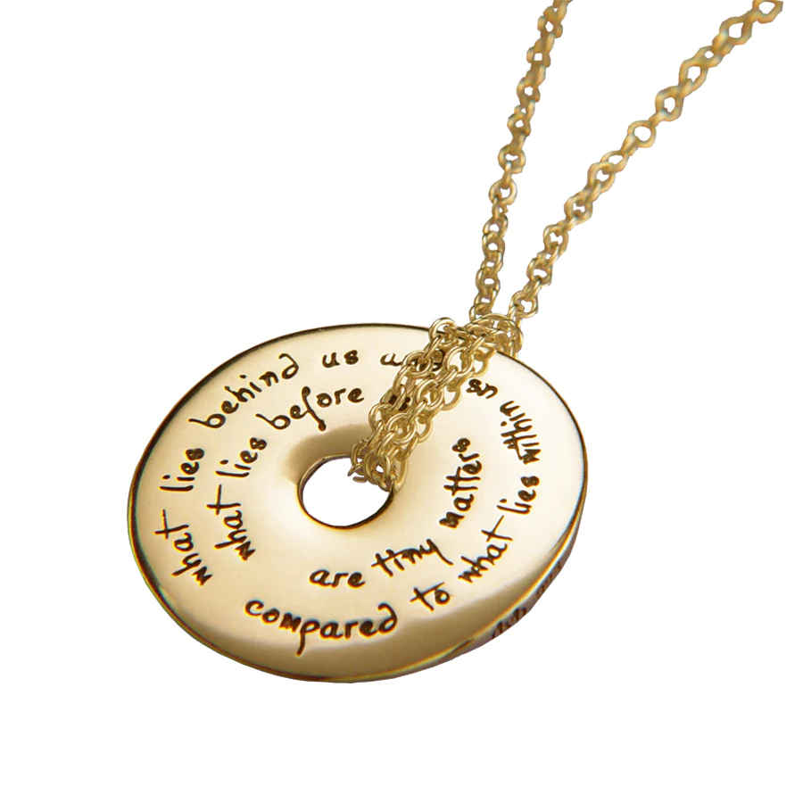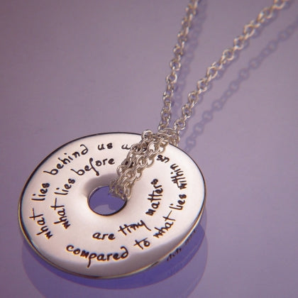 This sterling silver Pi disc necklace is finely engraved with inspiring words on the value and meaning of self reliance from the pen of nineteenth century American poet Ralph Waldo Emerson: