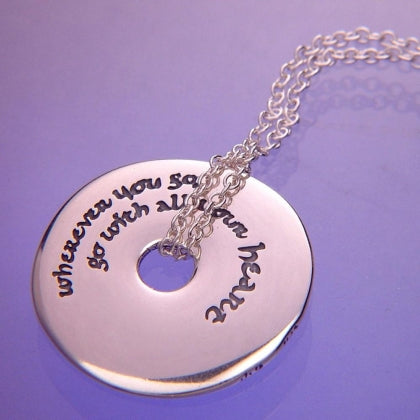 This sterling silver Pi disc necklace is finely engraved with a quotation from Confucius: