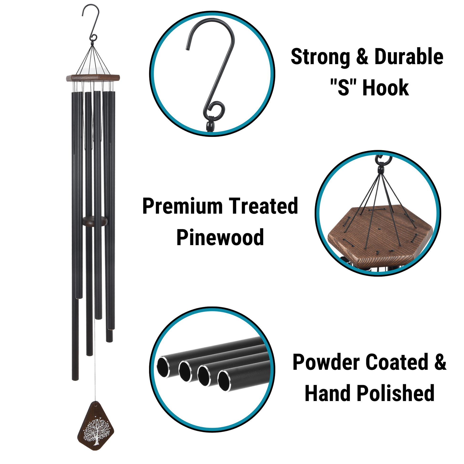 The wood parts are made from premium pinewood, durable, excellent in endurance and highly resistant against wear. The 6 anodized aluminum tubes are corrosion resistant and thickened to 1" and make comforting deep tones. The large memorial wind chimes are 55" total length and will also become beautiful addition to a grand porch, memorial garden, or backyard patio.