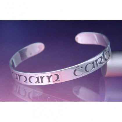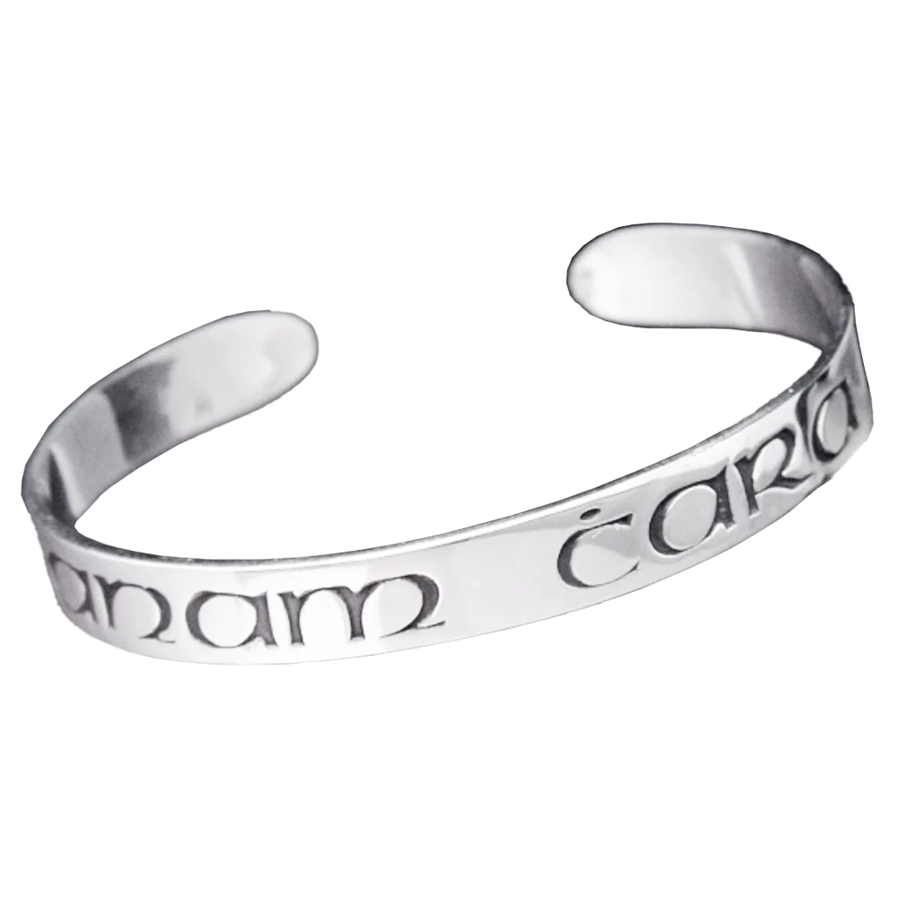 This sterling silver cuff bracelet is inscribed with the Irish Gaelic for “Soul Friend”: