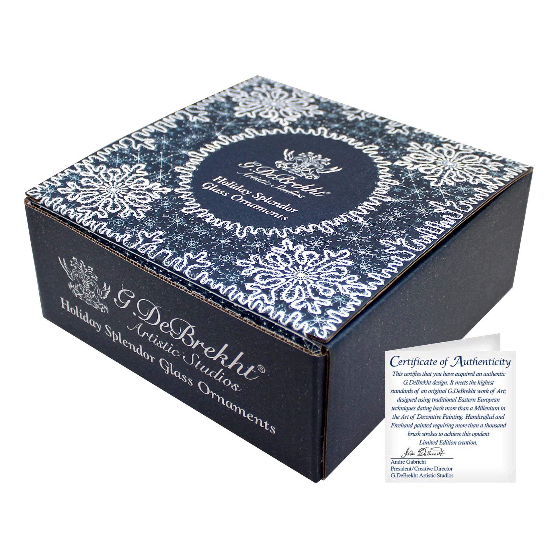 About Collection: This Limited-Edition Holiday Splendor Collection has been inspired by an old world-Eastern European family, who for almost 200 years had been painting beautiful miniature lacquered paper boxes inlaid with mother of pearl. It took years of perfecting this technique to establish this new and innovative form of painting that we now proudly present in our exclusive G. DeBrekht Glass ornaments.
