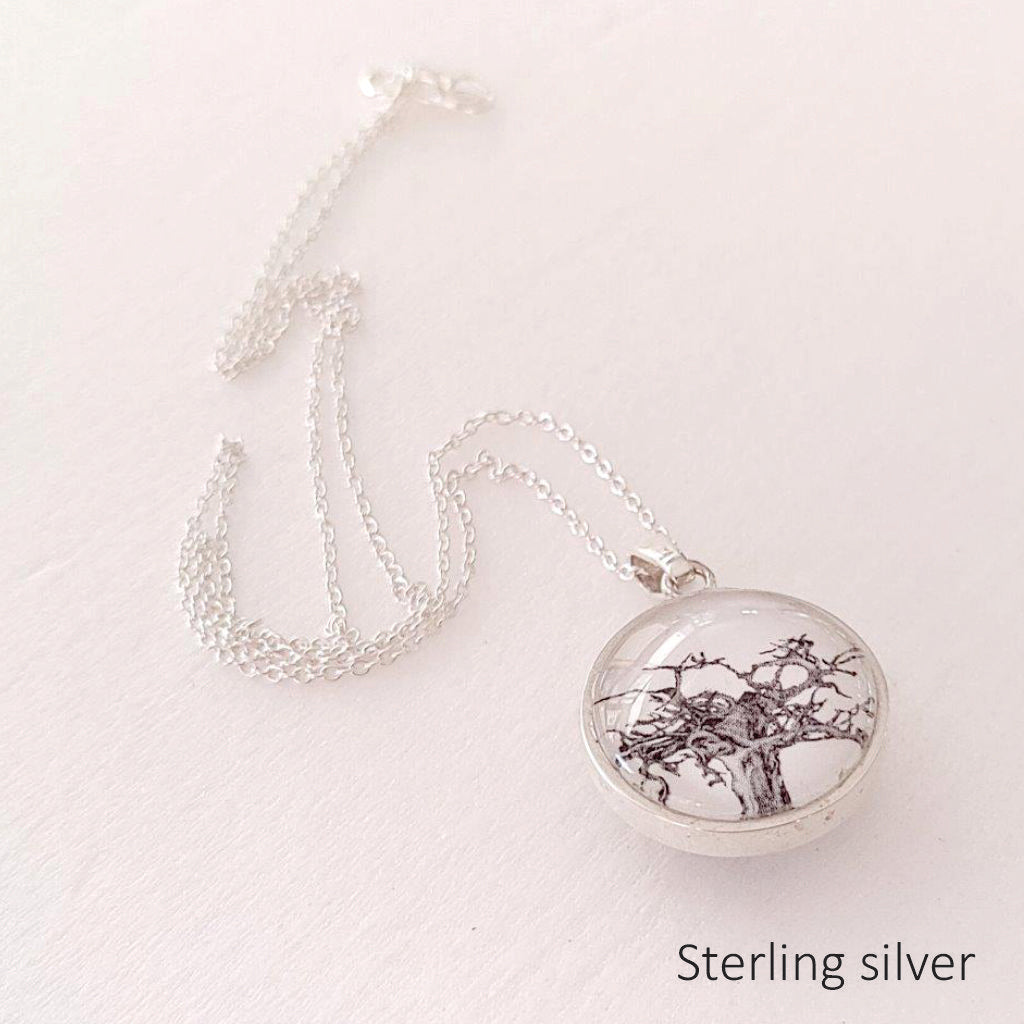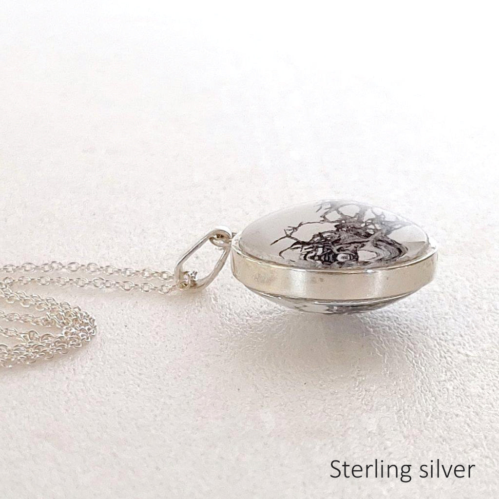 • Small (.75 inch) or Large (2 inch) sterling silver pendant with glass-domed cabochon.