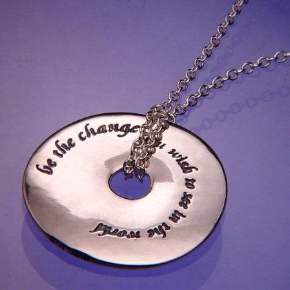 This sterling silver Pi disc necklace is finely engraved with a quotation from Mahatma Gandhi: