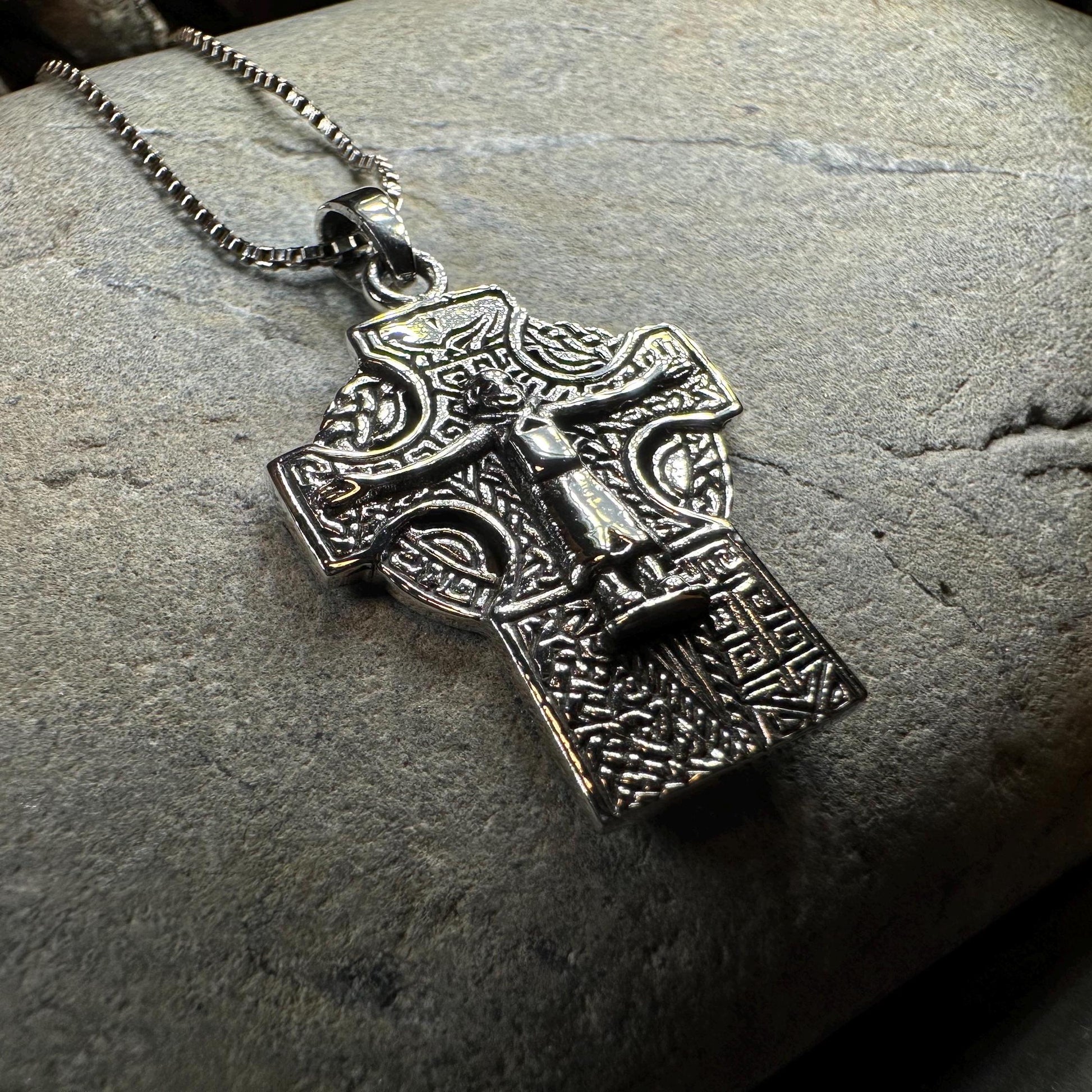 This cross is inspired by the many beautiful Celtic crosses found in Ireland and Scotland. A highly attractive Celtic Sterling Silver Cross, with a design based on a traditional stone carved Celtic Cross and the traditional Crucifix crosses.