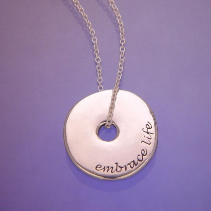 This sterling silver Pi disc necklace is finely engraved onto an organic silver circle, with an invocation to live life to the fullest:
