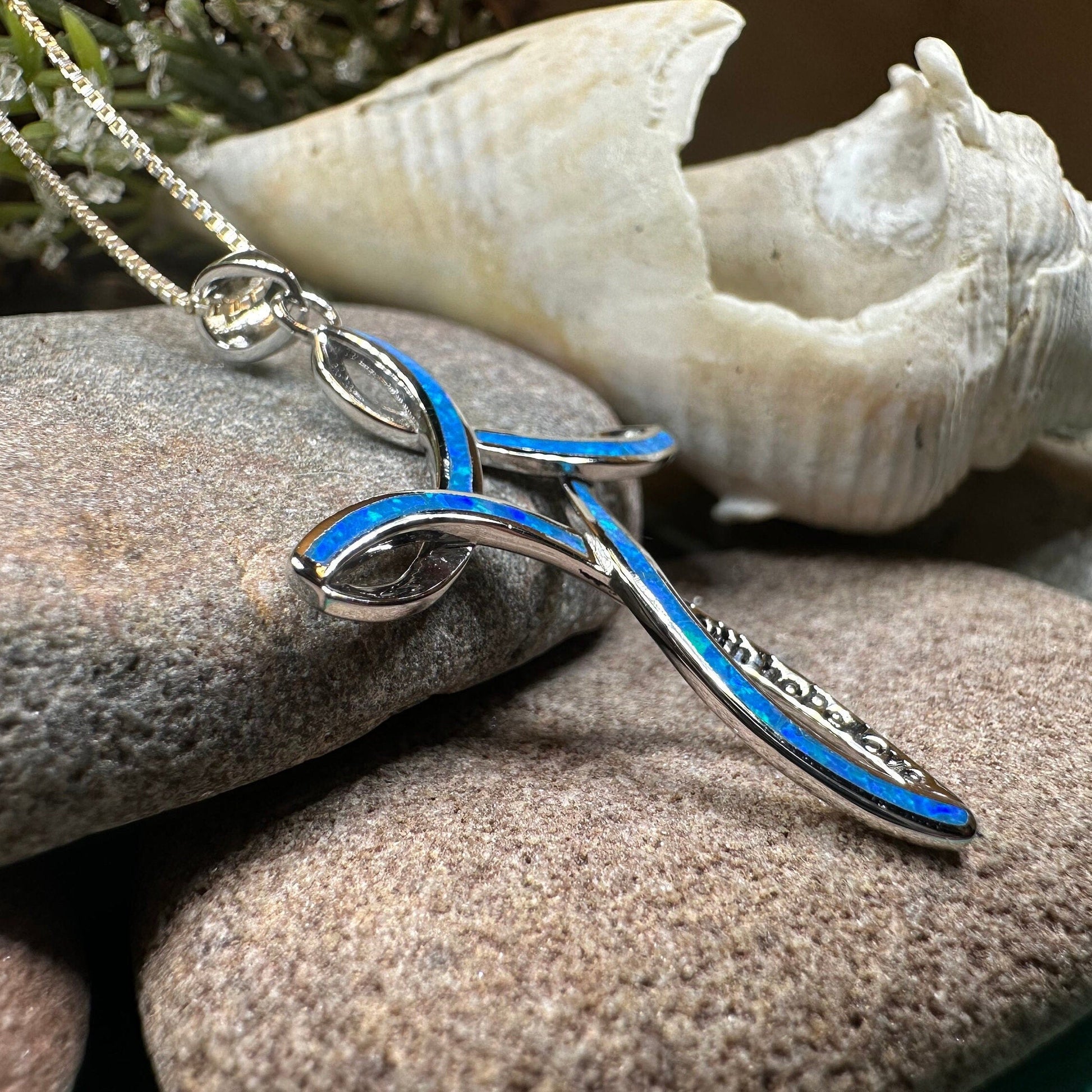 1 1/3" x 1 inch pendant size on an 18" silver chain in your choice of white fire or ocean blue opal inlay.