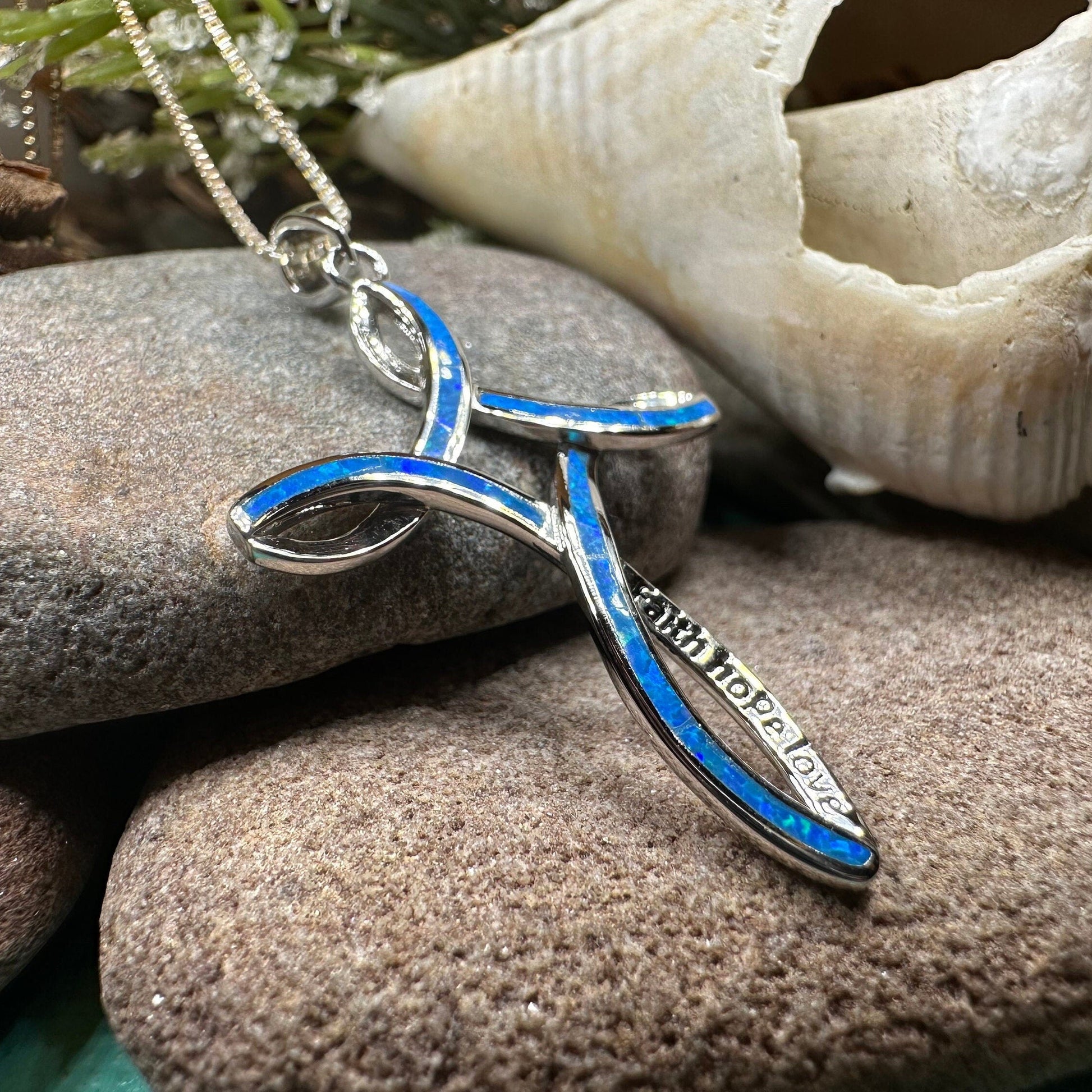 The created opal inlay makes this cross extra special. The white fire or ocean blue created opal sparkles and shines with vibrant color to create a feminine and unique Celtic cross that will be treasured for a lifetime.
