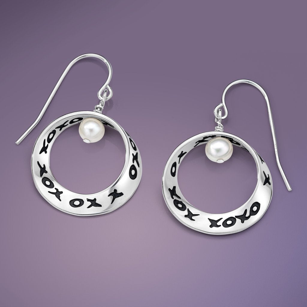These sterling silver Mobius Earrings are finely engraved with the endearing symbol for hugs and kisses and feature a dangling pearl.