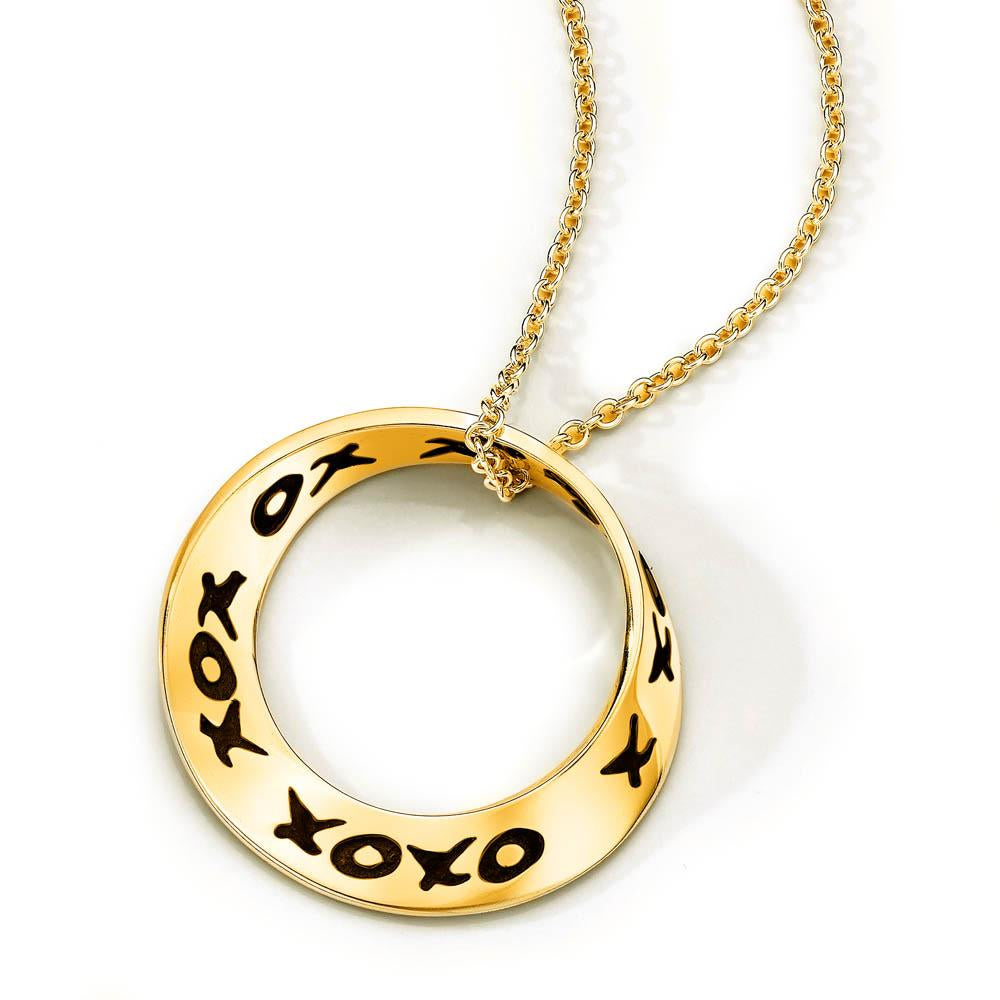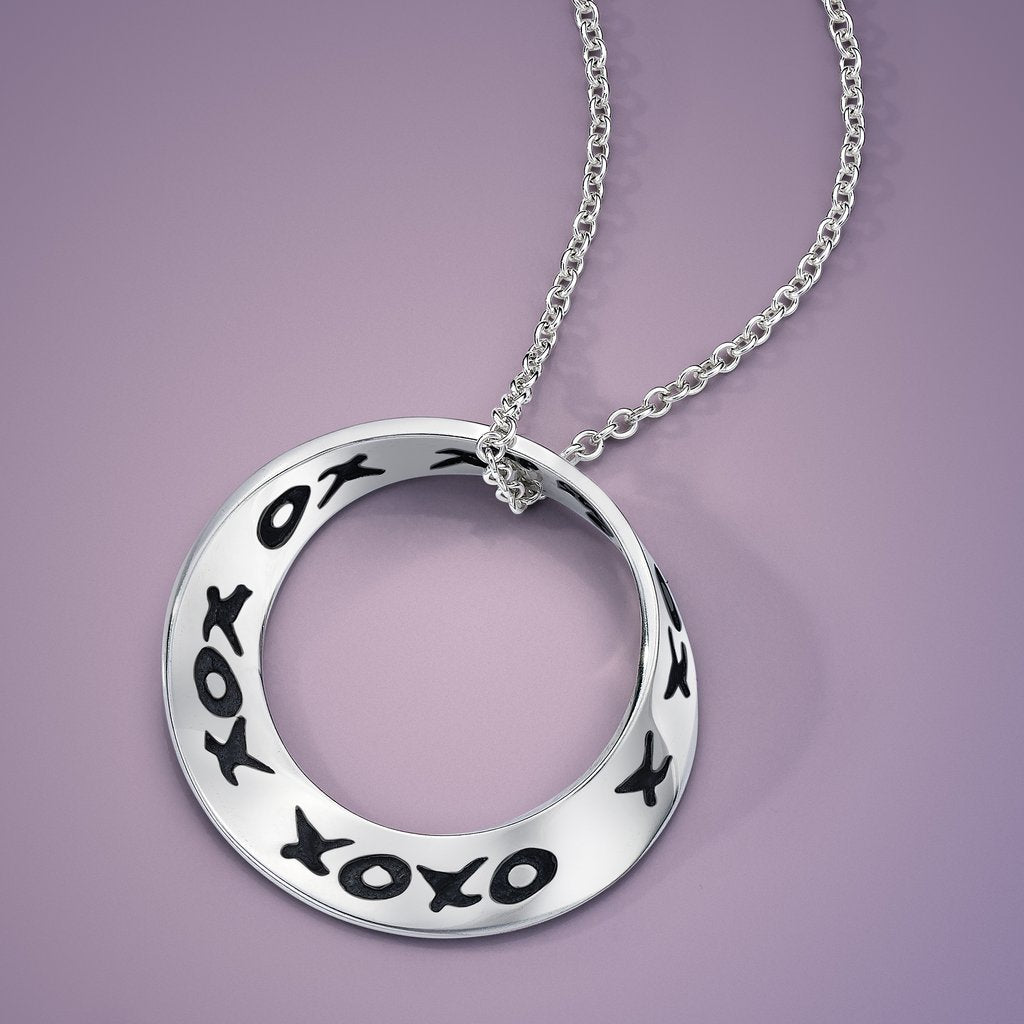 This sterling silver Mobius necklace is finely engraved with the endearing symbol for hugs and kisses.