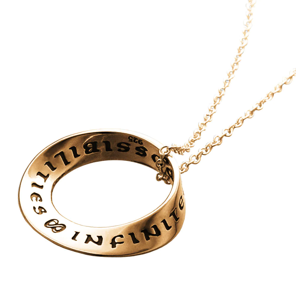 This remarkable piece of jewelry employs the uniquely beautiful geometric form known as a Mobius strip, named after the talented German mathematician, August Ferdinand Mobius (1790-1868). The cleverly curved design of the Mobius strip appears to have one uninterrupted side or plane, allowing the bracelet or pendant to be inscribed with a surprisingly large number of meaningful