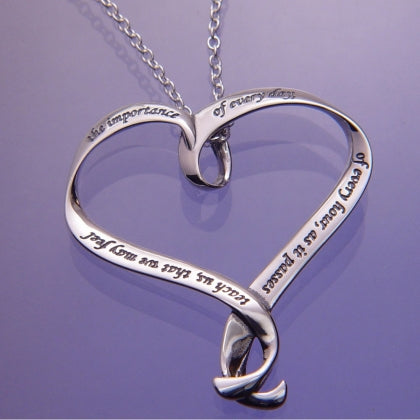 This sterling silver ribbon heart pendant is finely engraved with a quotation from 19th century British writer Jane Austen, who wrote several prayers in addition to her well loved novels. This prayer is about appreciating each and every moment as it passes: