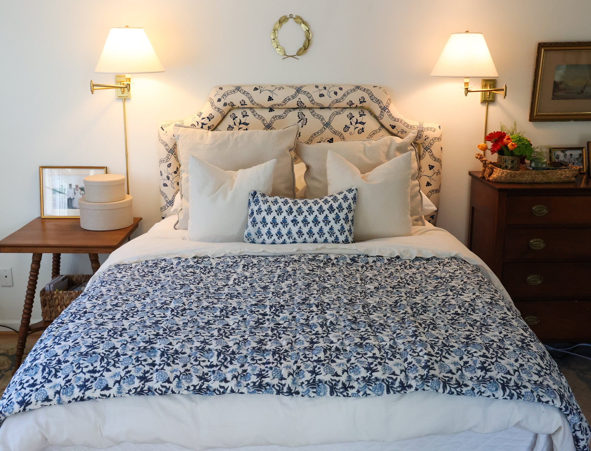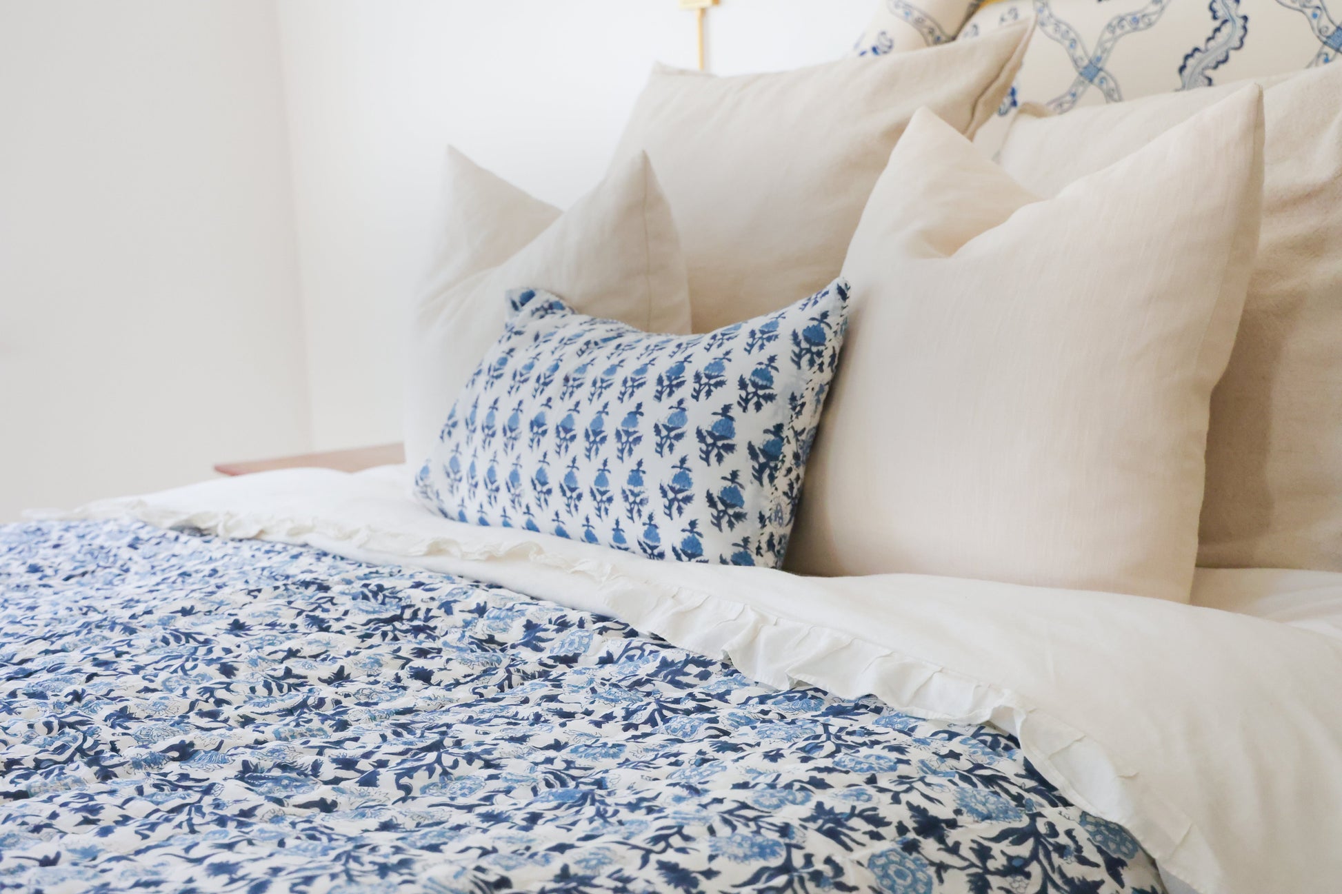 Each quilt is hand block printed and hand quilted in India from ethically-sourced materials. The quilts are printed on 100% cotton muslin with a thin layer of cotton between each layer. They make the perfect cozy throw or light, airy bedding.