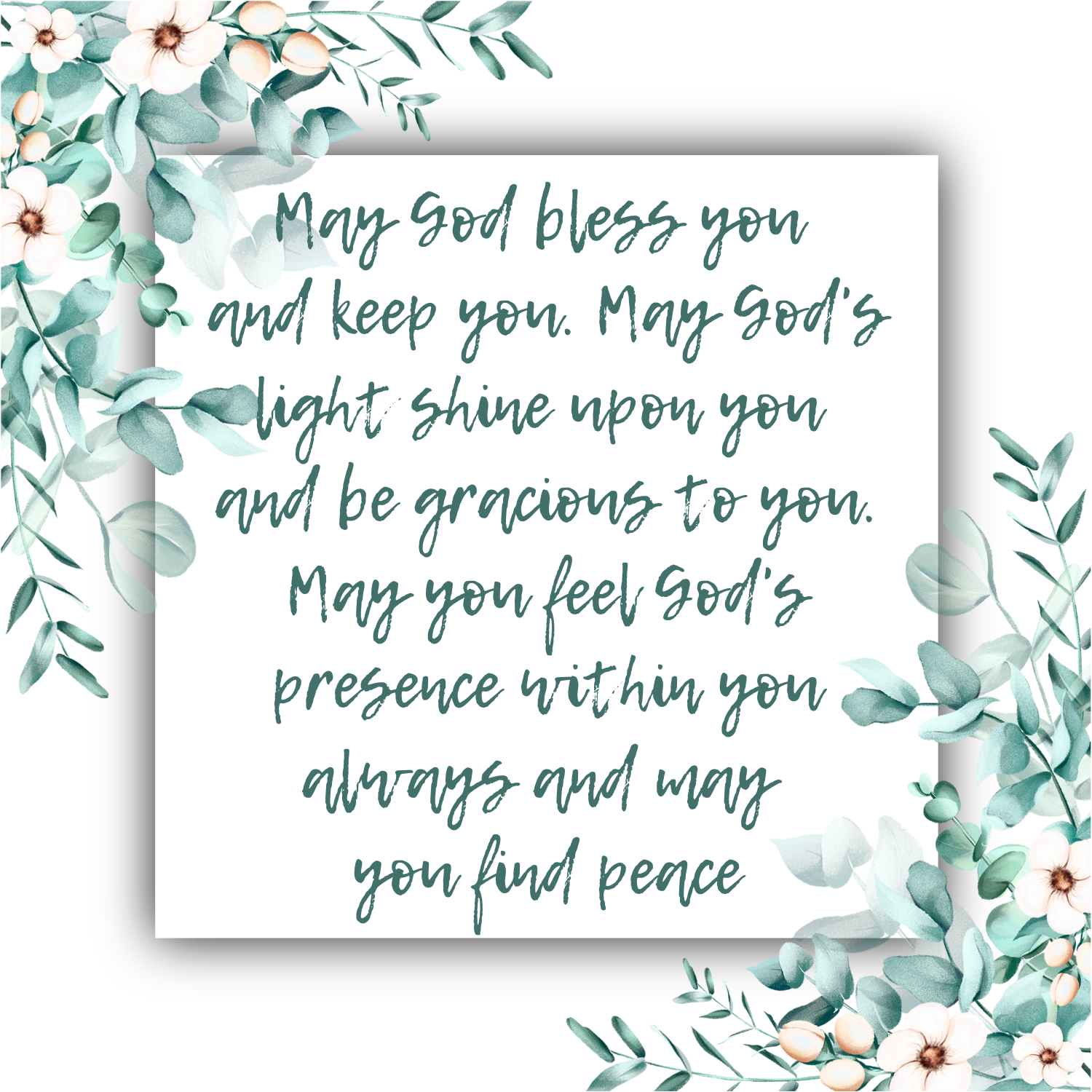 "May God bless you and keep you. May God's light shine upon you and be gracious to you. May you feel God's presence within you always and may you find peace."