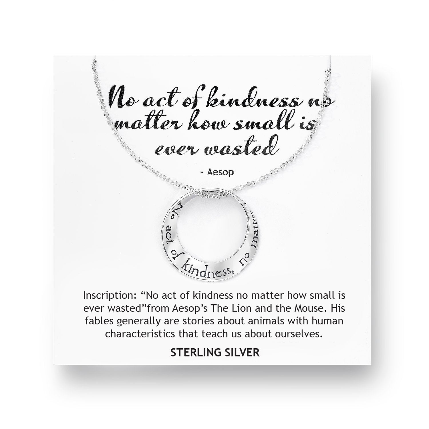 This elegant sterling silver Mobius necklace is finely engraved with a quote from Aesop's fable of the Lion and the Mouse: