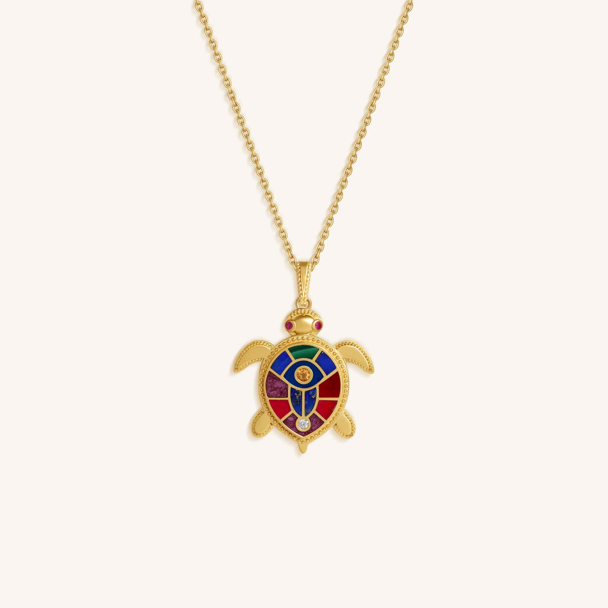 Embrace the calming rhythm of the sea with the Ocean Tranquility Turtle Charm Necklace. This LIMITED EDITION piece is crafted in a small, exclusive release, offering a meaningful expression of balance, strength, and serenity. Citrine, Lab-Grown Diamond, Pink Sapphire, Lapis, Malachite, Carnelian, and Garnet come together in a harmonious blend that reflects joy, clarity, and inner resilience. The turtle, a timeless symbol of endurance and longevity, serves as a gentle reminder to move through life with patience and grace. Finished in 18K gold-plated silver and brass, this handcrafted necklace captures the tranquil beauty of the ocean in every detail.
