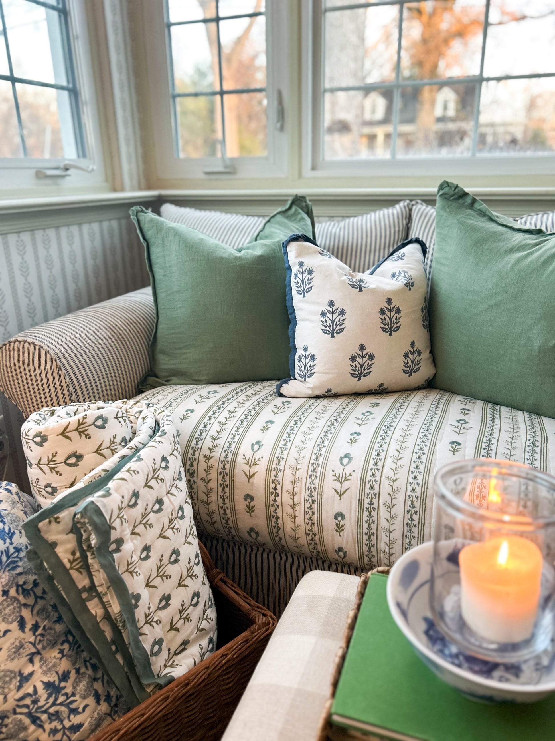 PRODUCT DESCRIPTION: This quilt features a small scale block print pattern in muted green and misty blue on one side, and a floral pattern in various tones of green on the other.