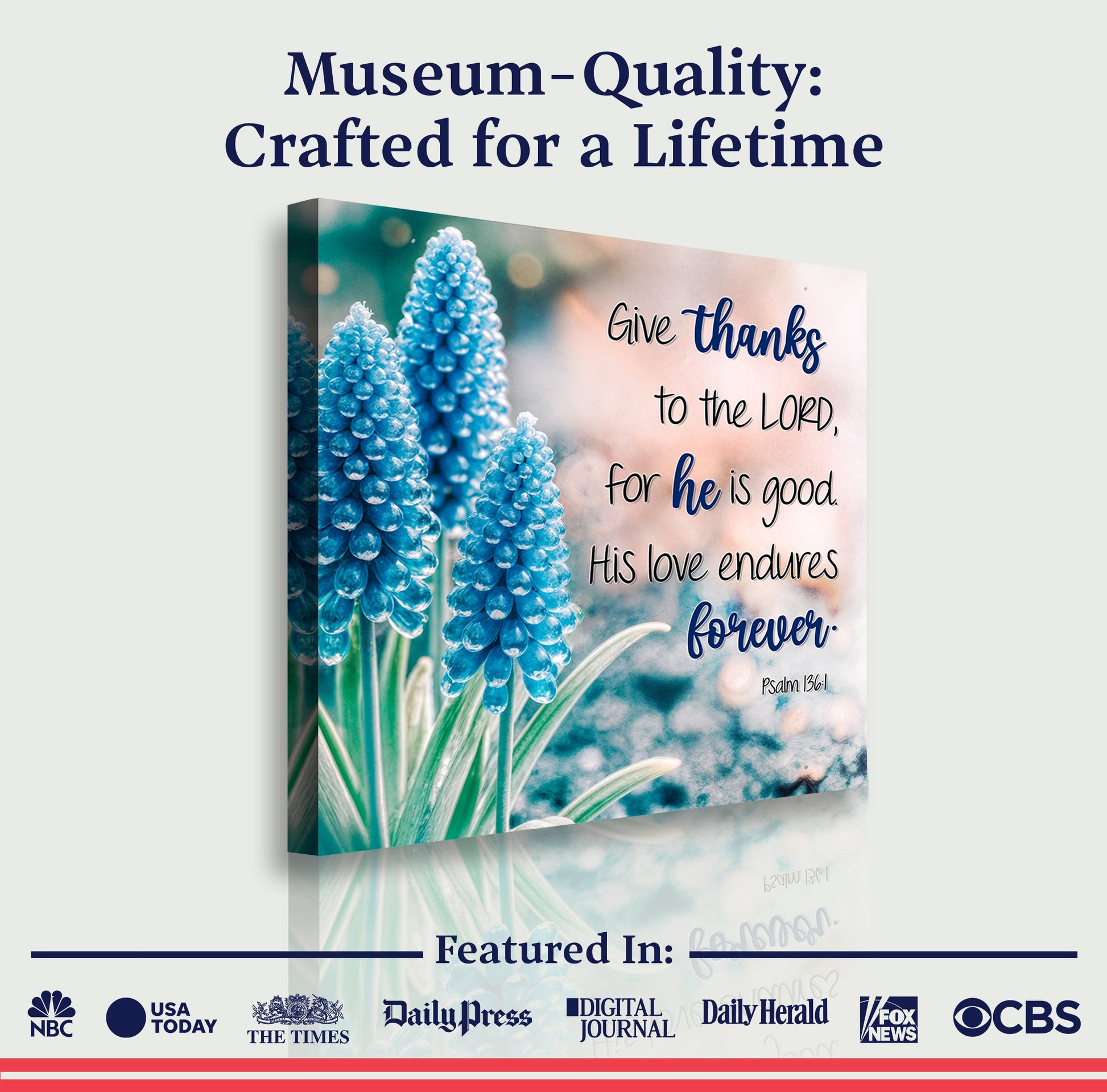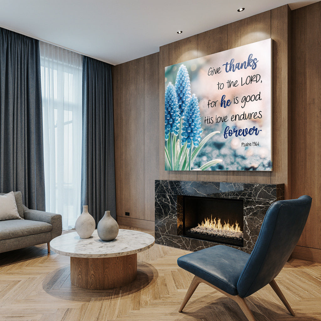 Psalm 136:1 on decorative wall art: Give thanks to the Lord, for he is good. His love endures forever.