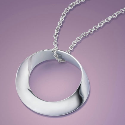 This remarkable piece of jewelry employs the uniquely beautiful geometric form known as a Mobius strip, named after the talented German mathematician, August Ferdinand Mobius (1790-1868). The cleverly curved design of the Mobius strip appears to have one uninterrupted side or plane, allowing the bracelet or pendant to be inscribed with a surprisingly large number of meaningful