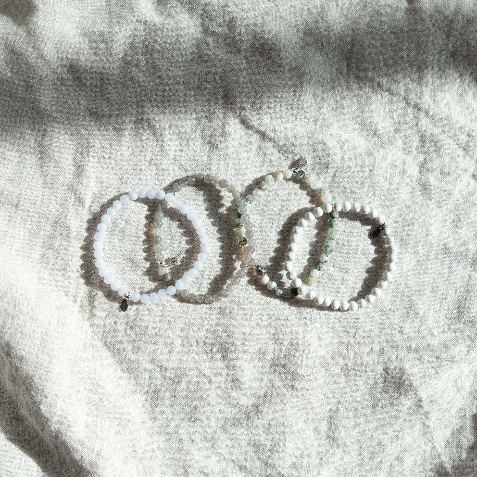 Say yes to serene living and cut out the stress factor with this special pack of serenity gemstone bracelets. Calling on the calm and nurturing nature of gentle Blue Lace Agate, heavenly Howlite, the mystical light of Labradorite, and the tried and tested natural power of Tree Agate, together this pack is perfect harmony.