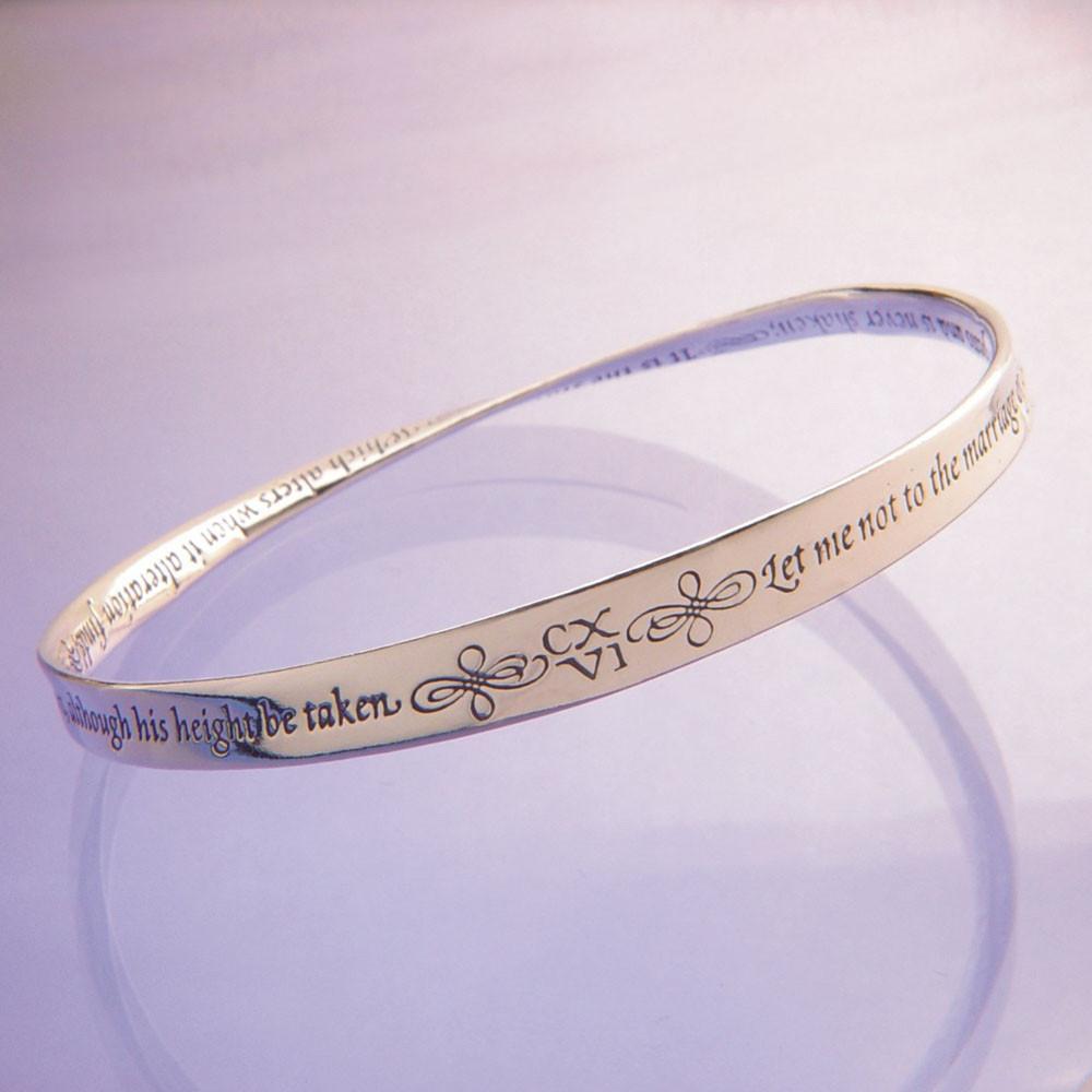 This elegant sterling silver mobius bracelet is inscribed with a quote from Sonnet 116 by well-loved English poet and playwright, William Shakespeare: