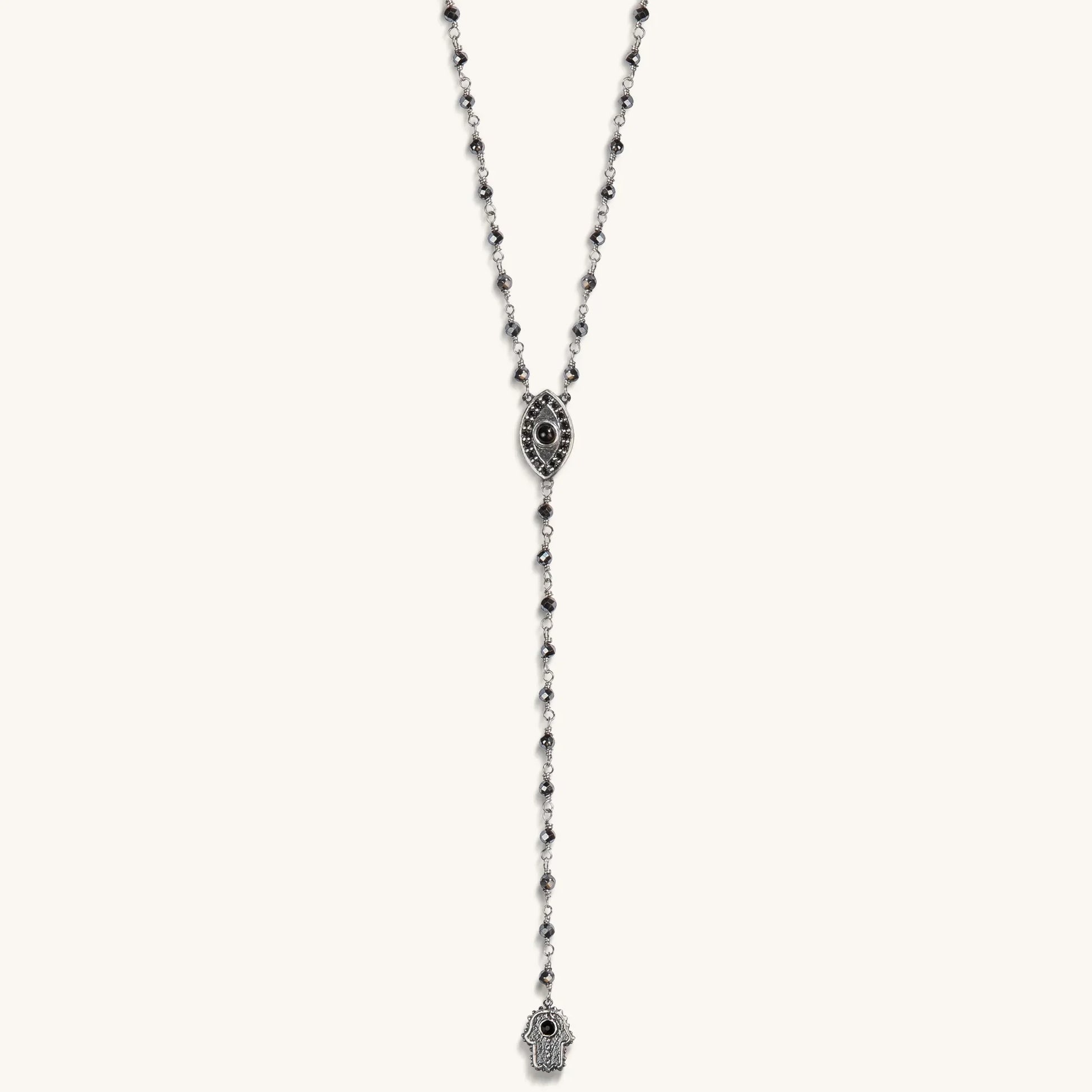 When we are grounded in peace, we open our hearts to all the blessings of the Universe. Our mighty "Stand in Strength Rosary Hematite Stone Necklace" fuses the two almighty symbols: the Hamsa hand and the Evil Eye. This ethereal combination steers you towards the path of luck, while the Hematite stones will keep you grounded, focused and centered, thereby revealing that like the sky, your dreams are actually limitless. These powerful beads will anchor you to the earth and provide a feeling of stability when you rejoin the hectic pace of the modern world.
