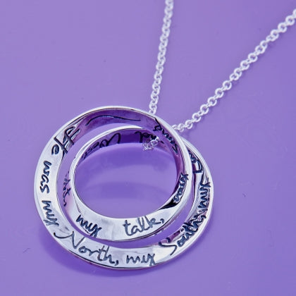 This sterling silver Mobius necklace features a double mobius which is finely engraved with part of the poet WH Auden's "Stop All The Clocks":