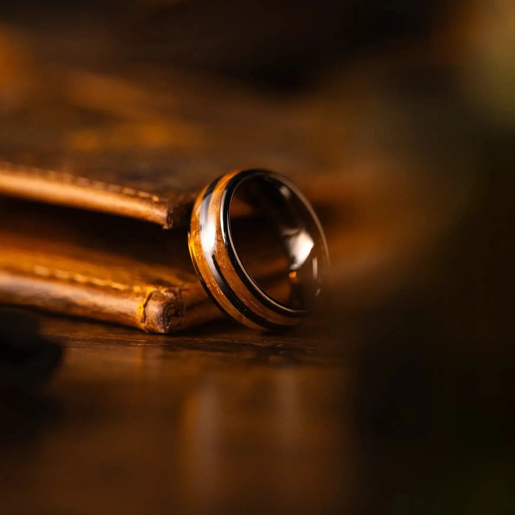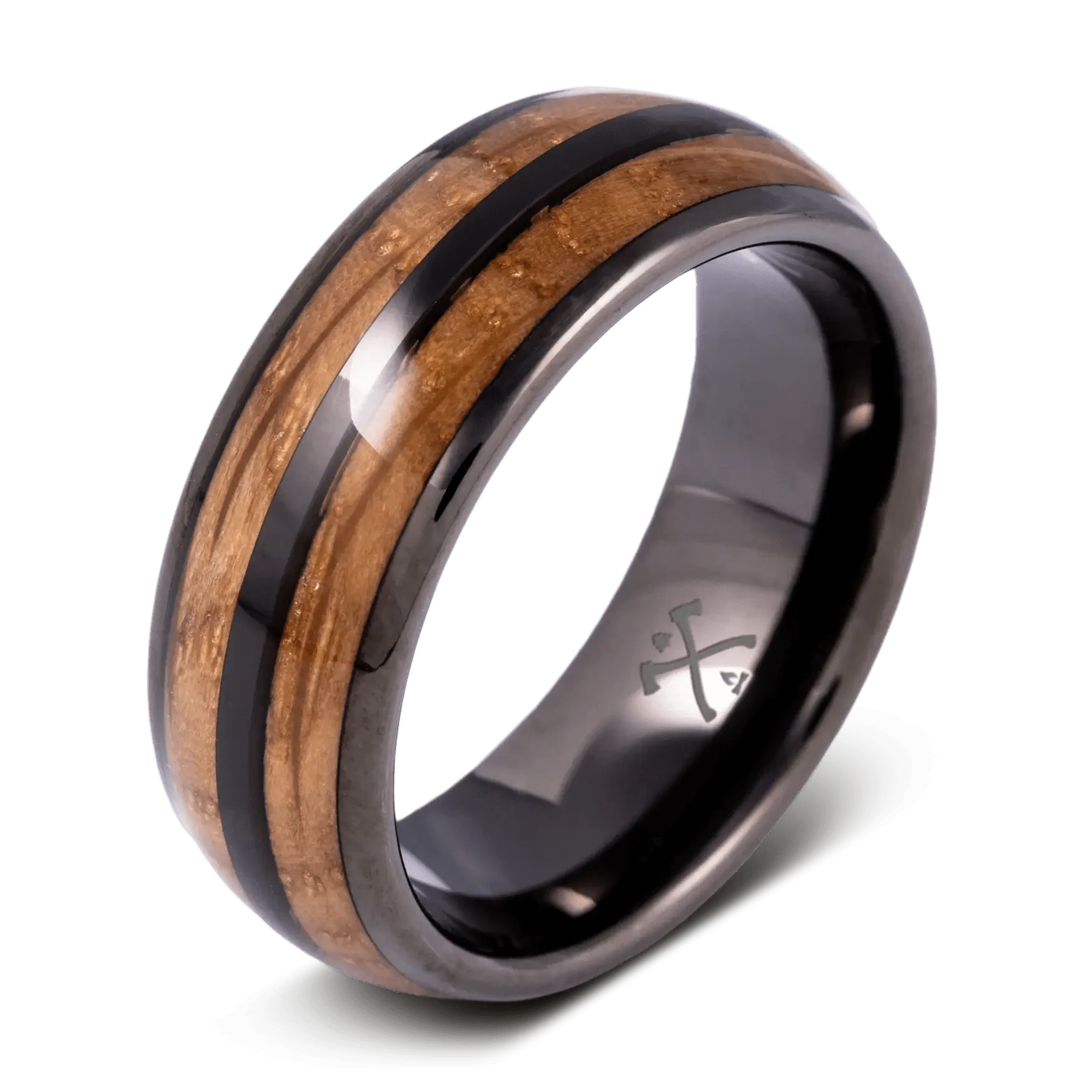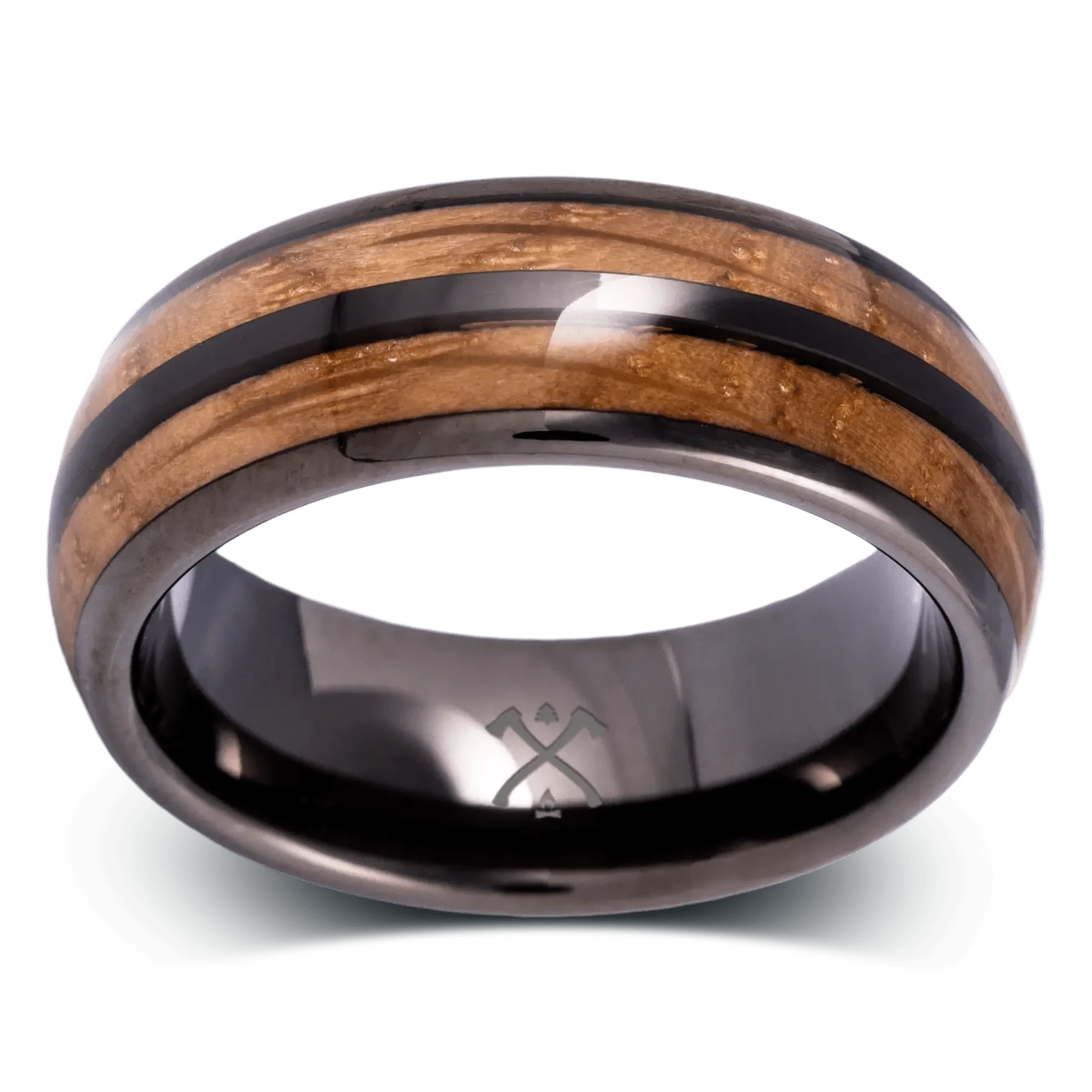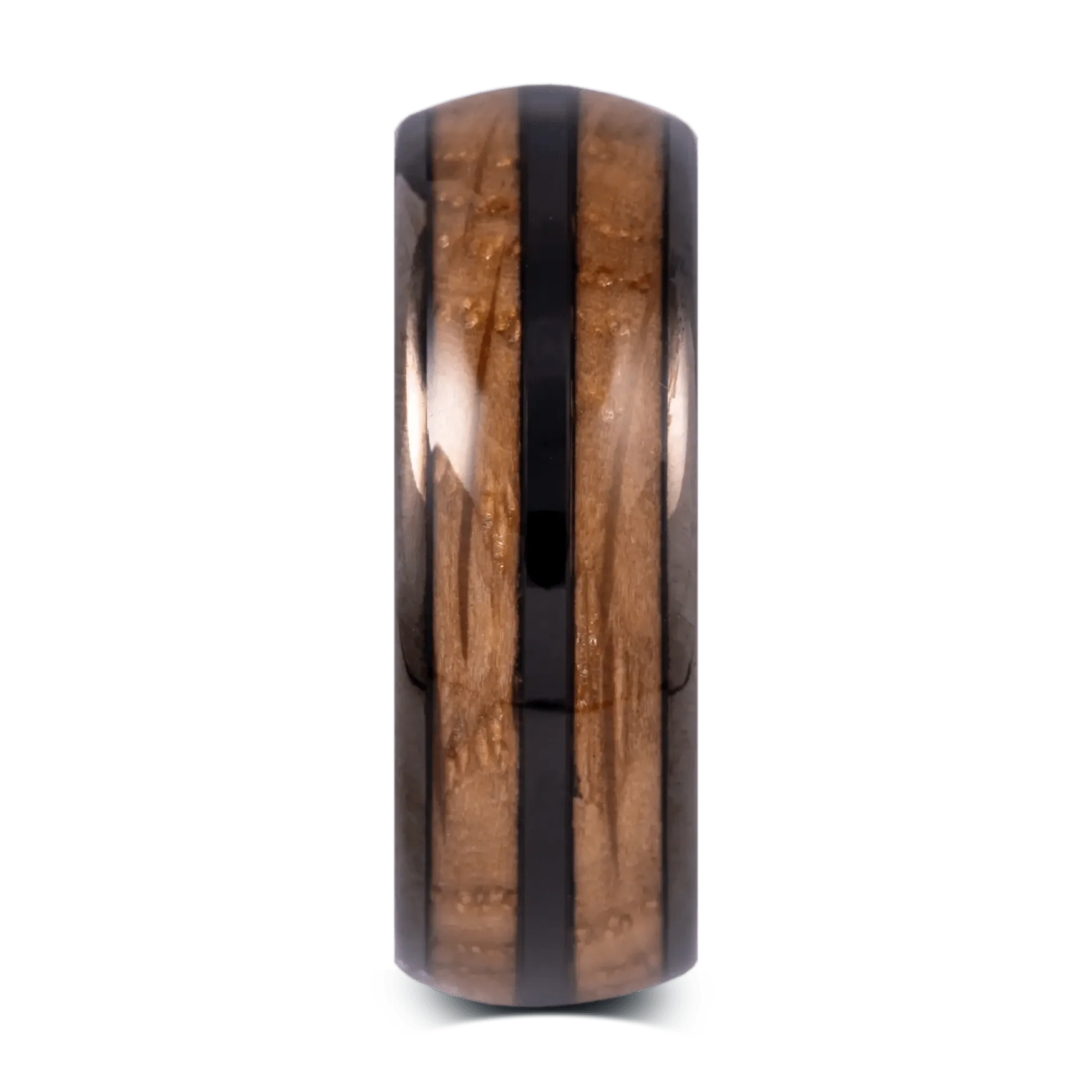 The Badger - Men's Ring / Wedding Band - Black Plated Tungsten with Double Oak Wood Inlays
