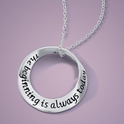 This inspirational quote is the dedication from Shelley's book Short Stories, vol II. Shelley's positive message encourages us to live in the present moment. Inscribed on our mini mobius shape, the symbol of infinity. The words have no beginning or end but continue forever around the mobius.