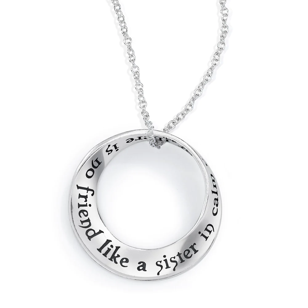 This elegant sterling silver Mobius necklace is finely engraved with a tribute to the uniquely strong and supportive bond between sisters. The perfect gift for that sister of your heart, whether family or friend: