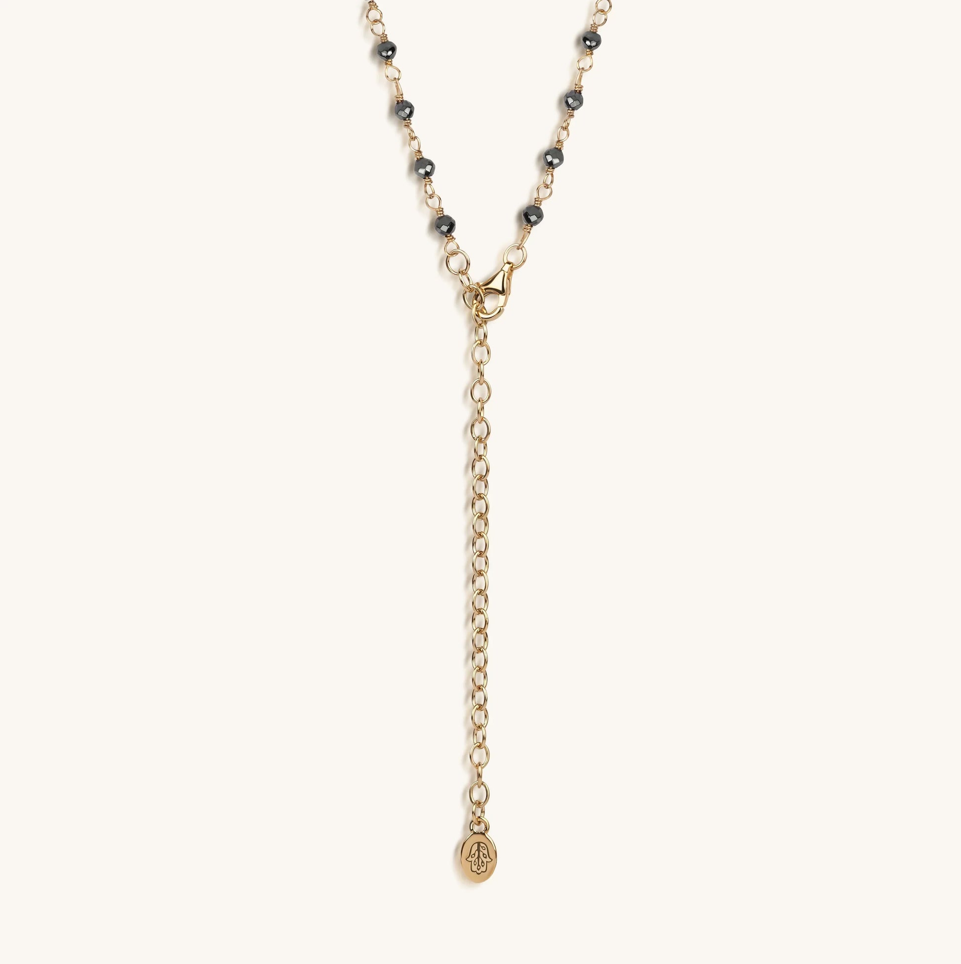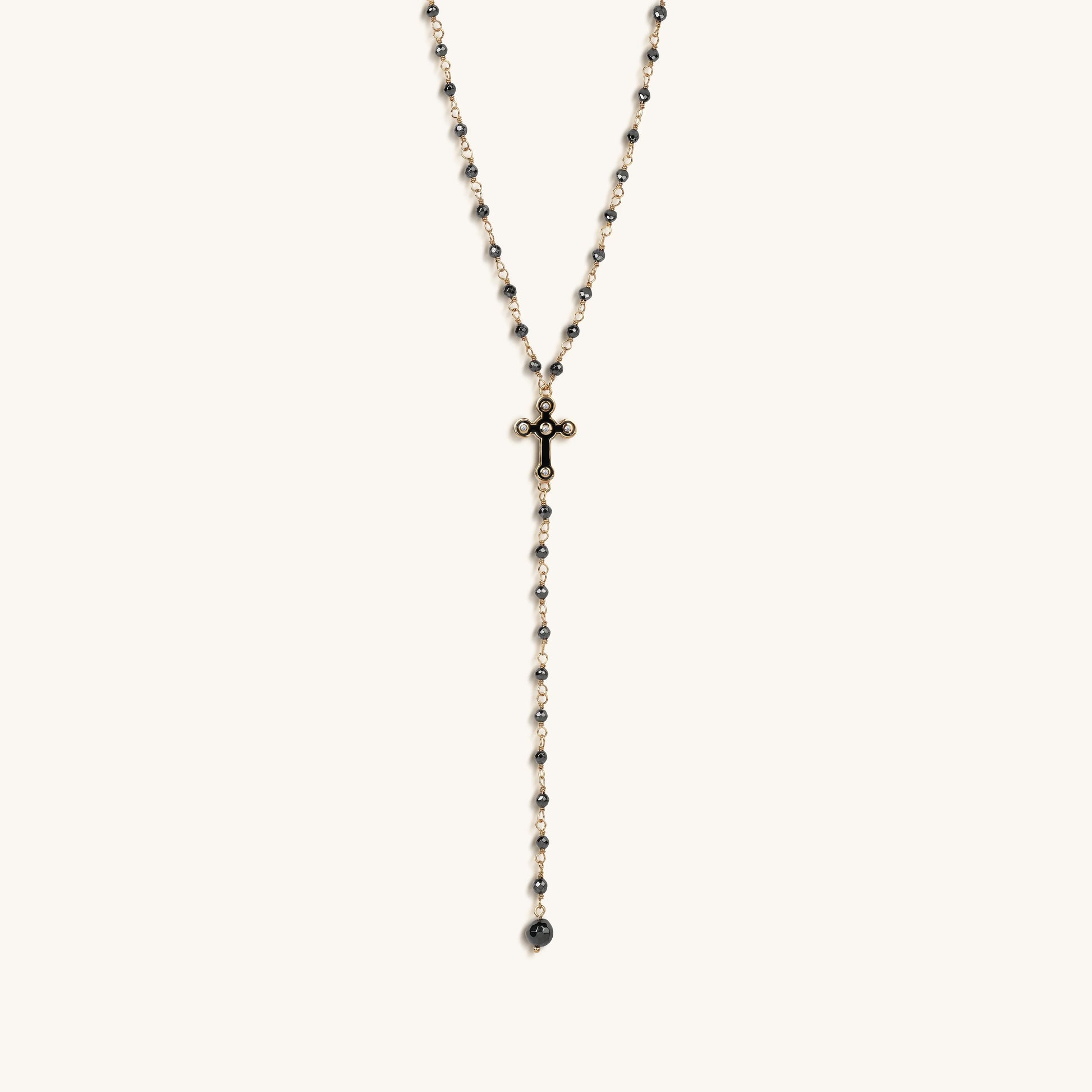 Faith empowers us to walk with steady steps through life's journey. Our artisans crafted this Hematite Rosary Necklace to strengthen the resilience that comes from faith. Each bead embodies stability, grounding you in the present. The Black Enamel and Diamond stand as a testament to the power of faith, even in the face of adversity. Let this necklace remind you to stay anchored in your beliefs.