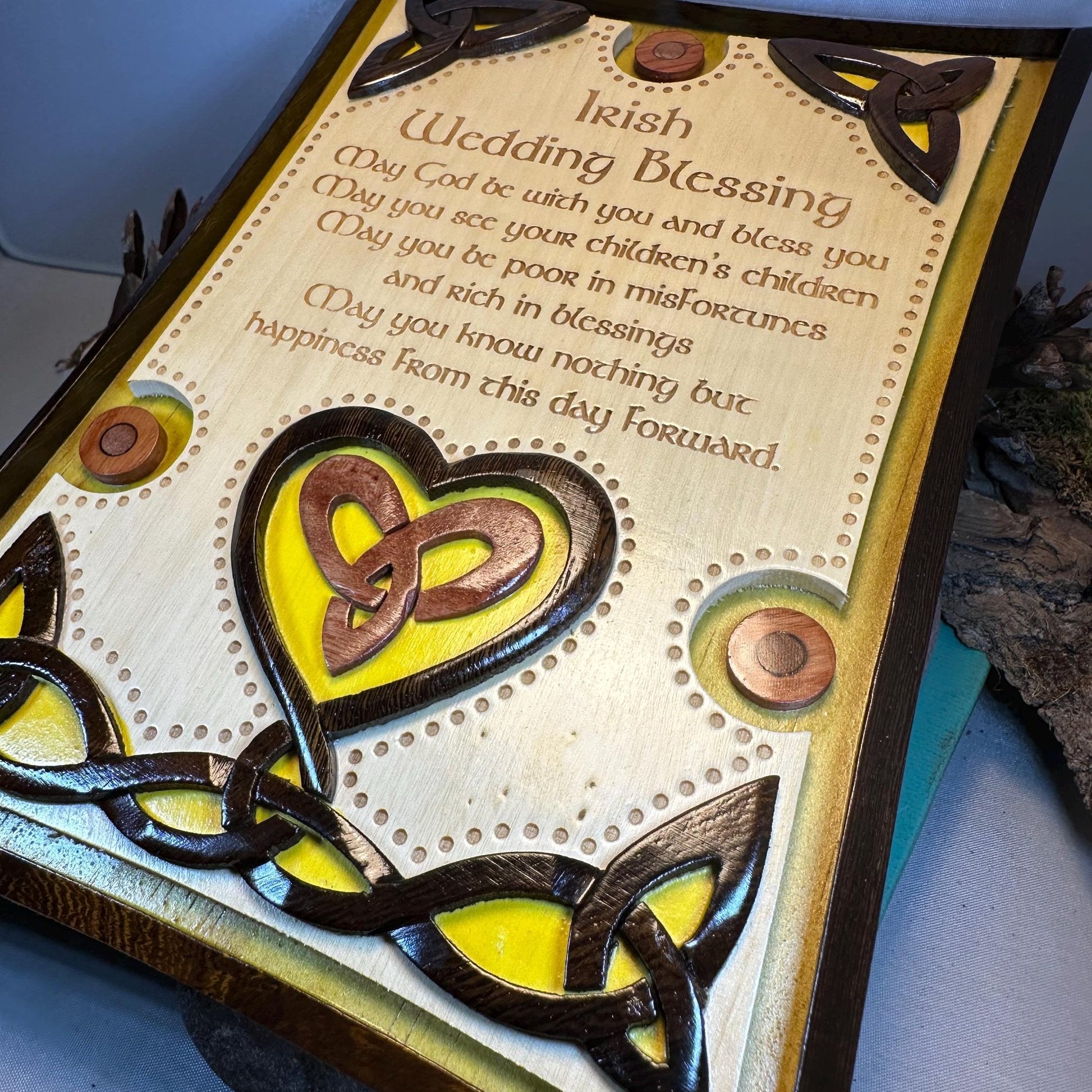 The design of this piece is unique because the lettering is etched into the wood rather than just applied to the surface. Various wooden pieces are stained in different colors to give this piece texture and interest - with Celtic Knotwork detailing.